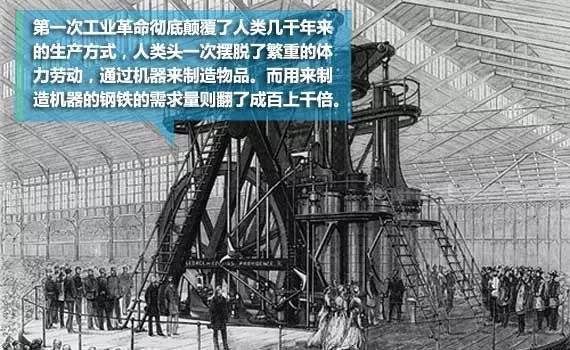 ÈËÀà¶ÔÓÚ¸ÖÌúÐèÇóÁ¿µÄµÚÒ»´Î·ÉÔ¾ÊǵÚÒ»´Î¹¤Òµ¸ïÃüʱÆÚ¡£ÕôÆû»úµÄ·¢ÏÖʹµÃÈËÀàµÚÒ»´ÎÕõÍÑÁË·±ÖصÄÌåÁ¦ÀͶ¯ºÍÒÀÀµÐóÁ¦½øÐеÄÉú²ú£¬È¼ÁÏÇý¶¯µÄ»úе½«ÈËÀàµÄÉú²úЧÂÊÌá¸ßÁ˼¸¸öÆ·¼¶¡£
